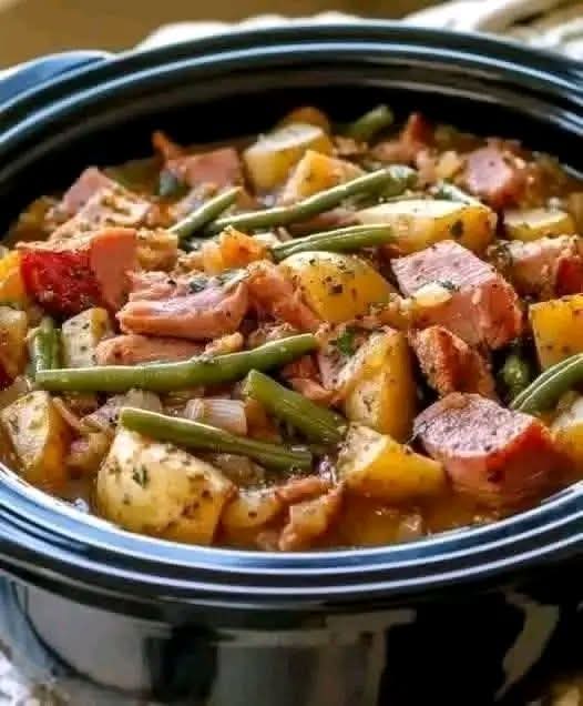 Stir gently to mix the ingredients before serving. This hearty, comforting dish combines smoky, savory flavors with the earthy goodness of green beans and potatoes, making it a simple yet satisfying meal.