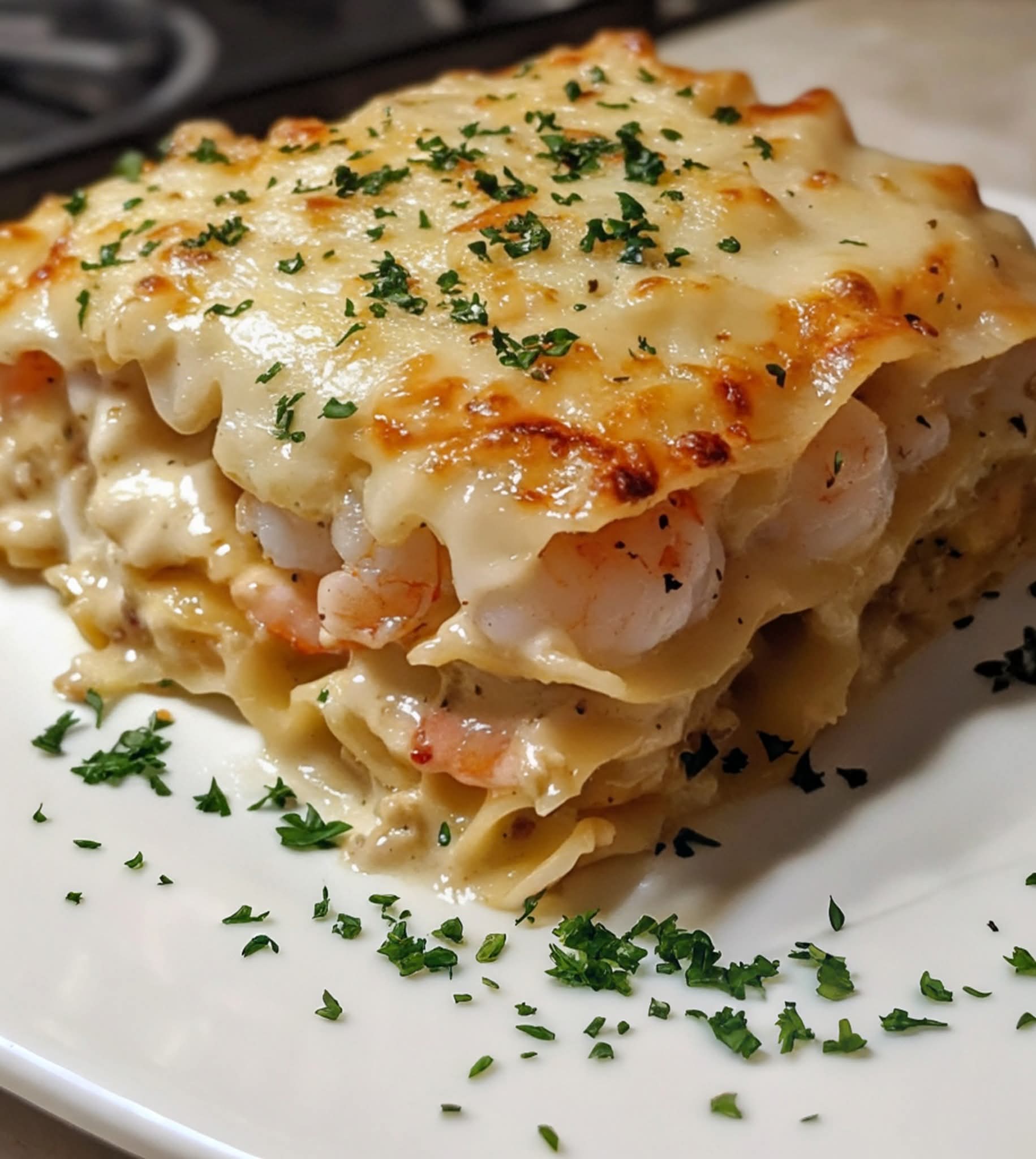 5️⃣ In a 9×13-inch baking dish, spread a thin layer of shrimp mixture. Add 3 lasagna noodles, then layer with half the remaining shrimp mixture, half the mozzarella, and a sprinkle of parsley.