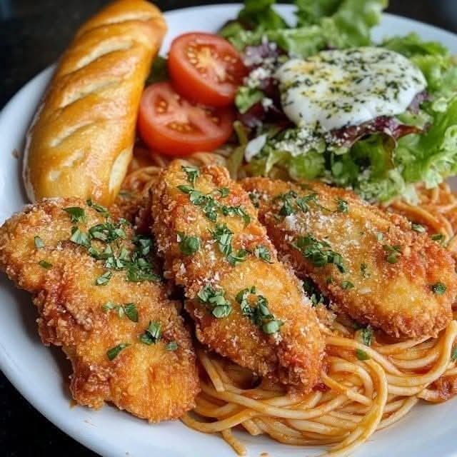 Enjoy this simple yet satisfying meal! Let me know if you give it a try – I’d love to see your pictures! #ChickenParmesan #SeniorFriendlyRecipes #EasyDinner #ComfortFood #Spaghetti .