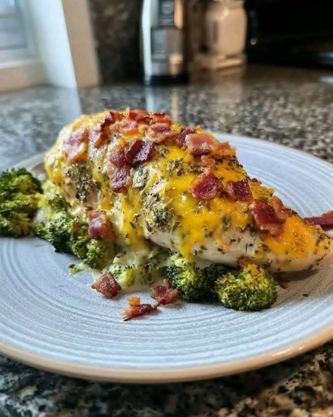 This looks like a juicy chicken breast stuffed or topped with broccoli, crispy bacon, and melted cheese—a perfect high-protein keto comfort meal.